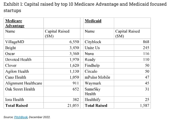 The funding chart below shows just how different investor interest has been between Medicare Advantage and Medicaid, with over $20 billion plowed into the top 10 MA startups, versus only $1.5 billion in the top 10 Medicaid startups. The article highlights nicely some areas where Medicaid innovation is necessary - access to care, SDoH, health equity, and VBC. Yet what the article doesn’t really touch on is that the issue here isn’t related to identifying innovation opportunities in either MA or Medicaid. It’s related to where there is an ROI for investors, and that Medicaid hasn’t been structured in a way that results in massive exits. The interesting question here to me is - if the top 10 Medicaid startups also had $20 billion of capital invested instead of $1.5 billion, would it have moved the needle at all on improving the state of Medicaid for patients?Link / Slack (h/t Paulius Mui)