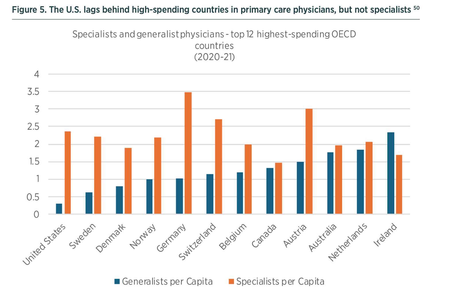 In primary care, for example, the U.S. lags our peer countries in generalists per capita by to a staggering degree: