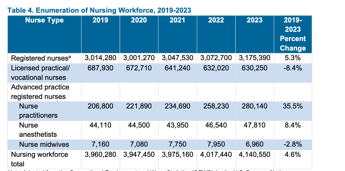 The latest statistics from HRSA show a promising 35.5% rise in nurse practitioners between 2019 and 2023 with over 334k advanced practice registered nurses in the United States at the time of the study, and a large and growing “bench” of registered nurses who could be trained into the role.