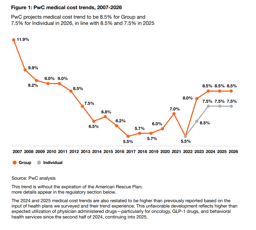 PWC published their annual Behind the Numbers 2026 report on medical cost trends with the ominous tagline: “No let up in sight. Medical cost trend set to grow at 8.5%. Is your playbook ready?” They also shared their full report, a 33-page in-depth document that covers what’s driving cost increases, what might curb them, and how payers should respond. I spent a good chunk of my week reading this report, so you don’t have to.