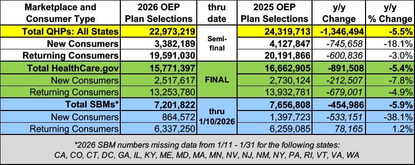 For comps from last year, as always, we’ll turn to Charles Gaba from acasignups.net, who notes that this is still not the final open enrollment number with the state exchanges reporting as of January 10th: