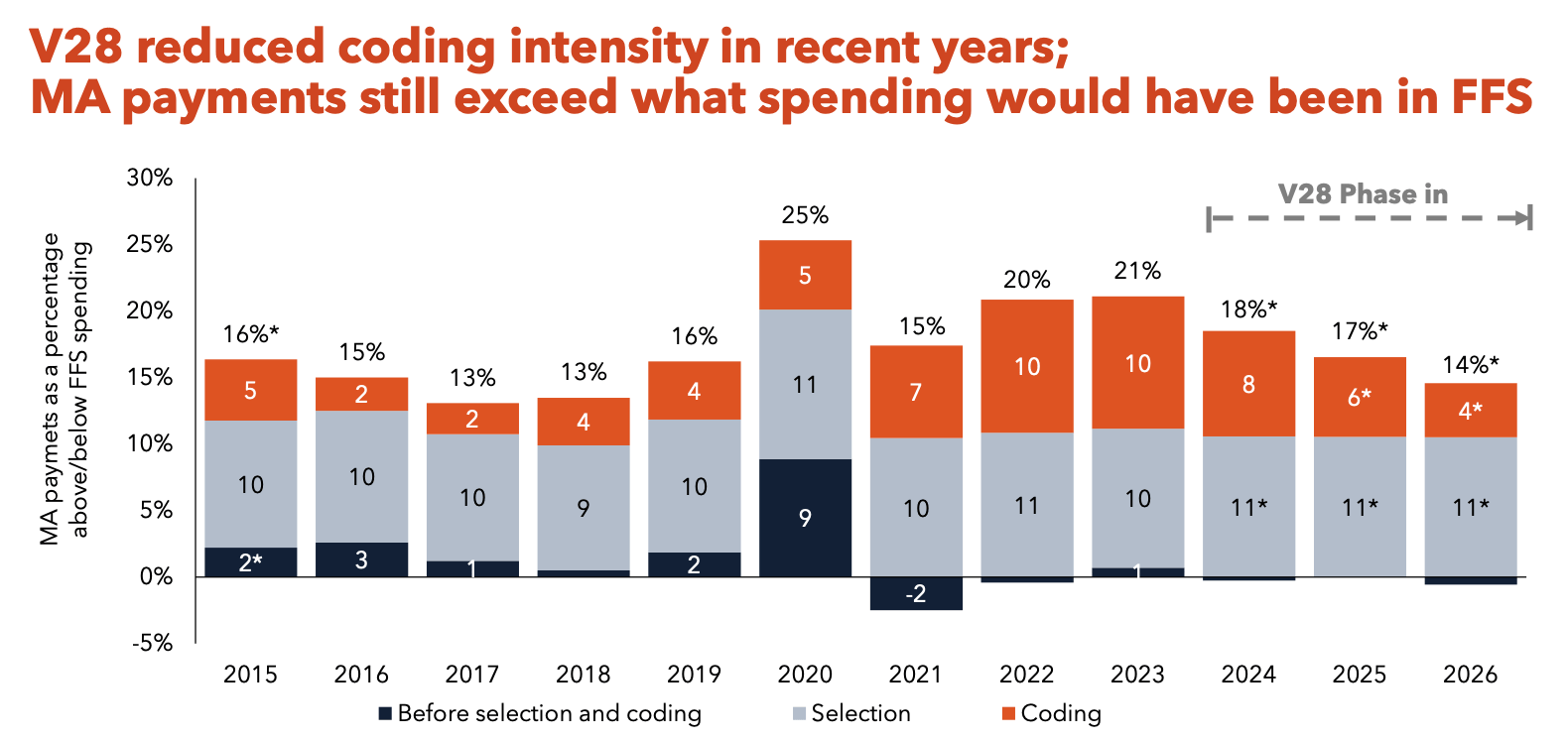 A largely unresolved issue is whether Medicare Advantage is more or less expensive than Original Medicare. Every year, MedPAC makes the case that it is more expensive in its annual status report on the program. About 14% more expensive due to coding and selection effects, if you’re curious, though, V28 did help. CMS leadership also published an interesting piece of research that found v28 eliminated most of the coding effects, bringing it down closer to the 1.5-2% range.