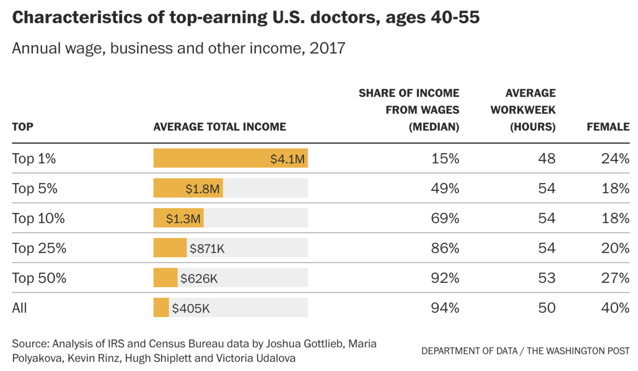 It’s not that individual physicians aren’t well compensated — the paper finds the average physician in the US makes $350,000, with the top 1% of physician earners making $4 million a year on average. This chart, from the Washington Post’s analysis of an earlier working version of the paper in 2023, highlights the income of top earners, focusing on providers in the 40 - 55 age range: