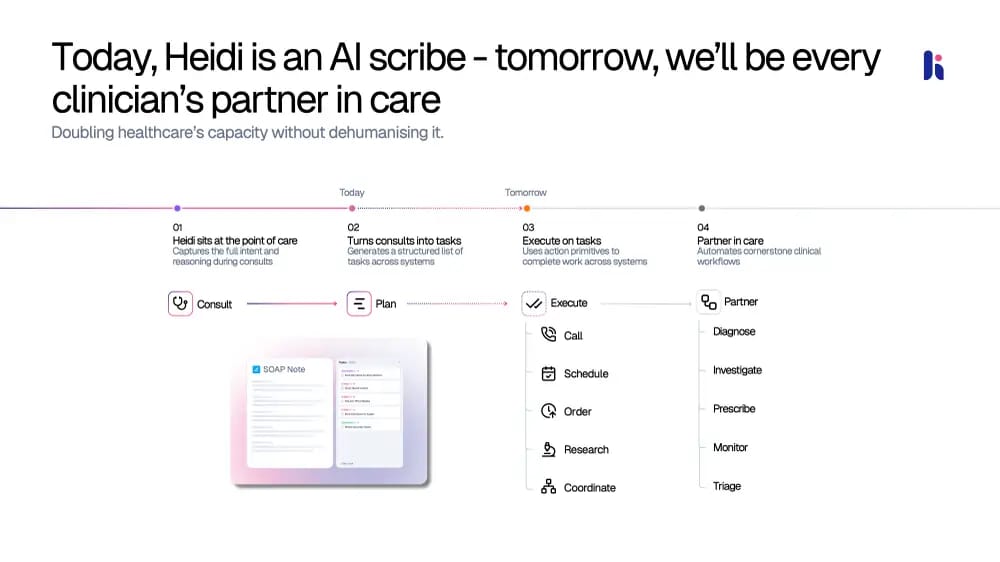 Heidi, an AI assistant for providers, raised $65 million at a $465 million valuation. Heidi has a heavy international presence, noting it is doing 2 million patient sessions per week across 116 countries in 100 different languages. Business Insider shared the pitch deck from the round here. This slide below about how Heidi intends to move beyond just transcribing today to become a clinician’s partner is a fascinating one: