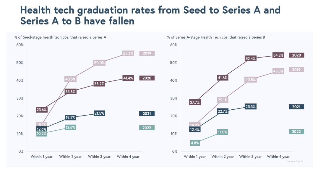 Bessemer’s Sofia Guerra and Steve Kraus shared the second installment of their healthcare benchmarking data. It includes some helpful data points, including the chart below highlighting how the rates at which startups are “graduating” from Seed funding —> Series A —> Series B rounds have declined significantly in the past few years. It mirrors some of the sentiment that I heard at HLTH this week around the early-stage funding environment (i.e. its hard).