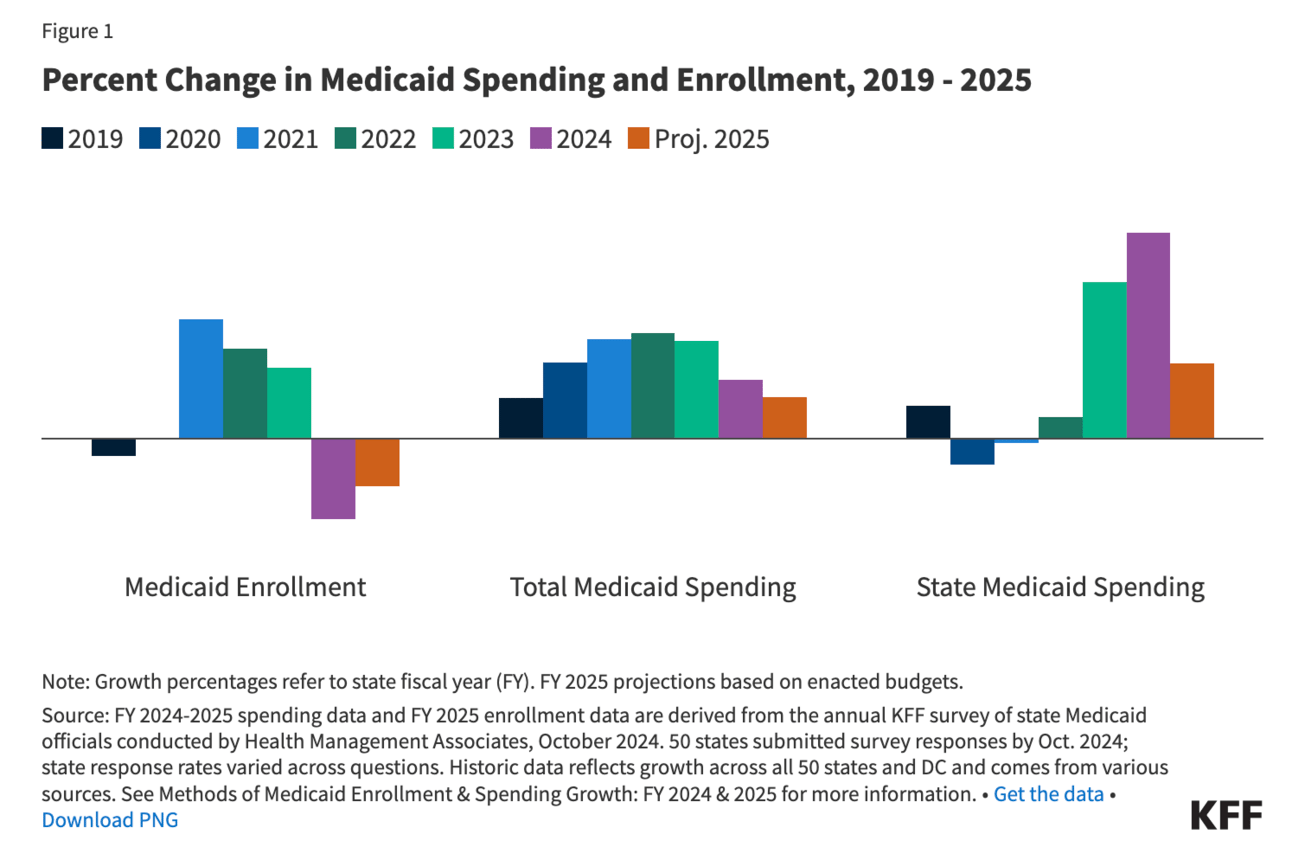 Given the amount of discussion on insurer earnings calls about the state of the Medicaid market, this KFF survey of Medicaid directors on Medicaid spending and growth for 2024 and 2025 feels timely. Directors expect enrollment to decline again in 2025 and the growth of total Medicaid spending to slow. It is interesting to note that over half of states think there is at least a 50/50 chance that they’ll experience a Medicaid budget shortfall, up significantly from previous surveys.