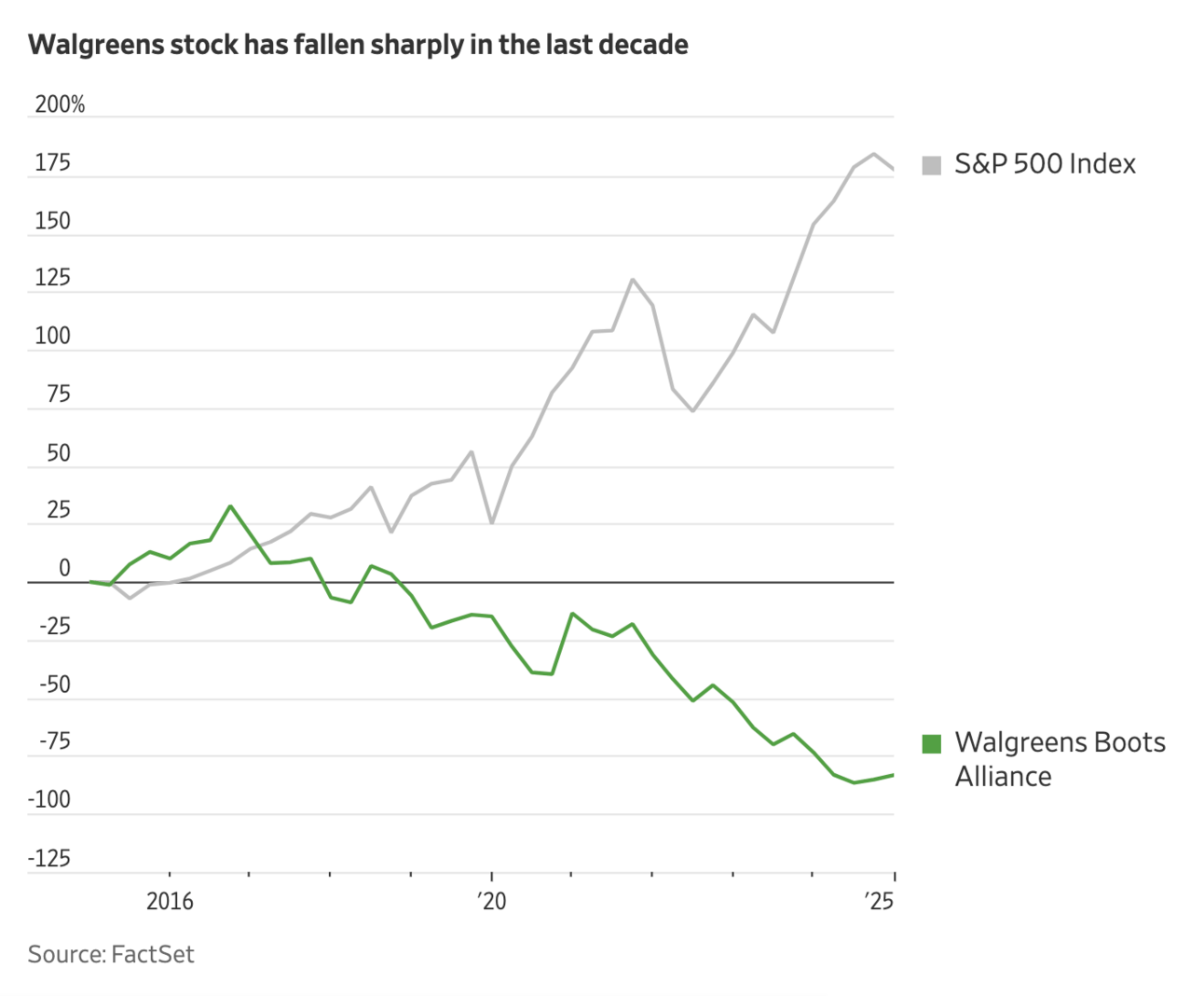 The WSJ published an interesting article looking at the unique deal-making journey of Stefano Pessina, the architect behind the Walgreens Boots Alliance business. It highlights how the company’s valuation has steadily declined over the past decade, falling from a peak valuation of around $100 billion in 2015. In 2019, there were rumblings of KKR potentially taking Walgreens private at a $70 billion valuation. The stock price decline over the last decade is eye-opening, particularly when you compare it to the performance of the S&P 500 over that period, as the WSJ did in the chart below: