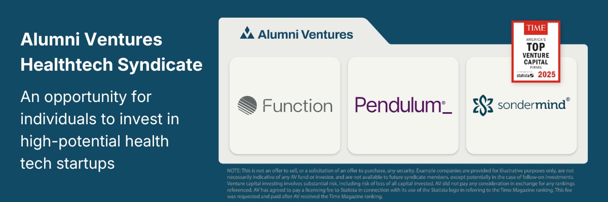 The Alumni Ventures Healthtech Syndicate gives individuals the opportunity to invest in health tech startups that are typically only accessible to institutional investors.