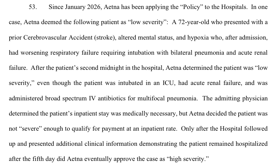 Jefferson Health filed a lawsuit against Aetna earlier this week, frustrated with Aetna’s new-ish payment policy change related to the Two Midnight rule. Aetna is now “downcoding” care it deems to be of lower severity. Jefferson argues that Aetna is changing the terms of its contract and shouldn’t be able to do so. To make the point, Jefferson presents the case below of a patient who was deemed low severity, which seems like a bad look for Aetna.