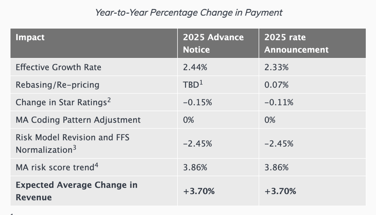Historically, CMS has typically revised the final rate notice to be more favorable to payors than the advance notice that came out earlier in the year. This year, though, CMS revised very little, as you can see in the chart below: