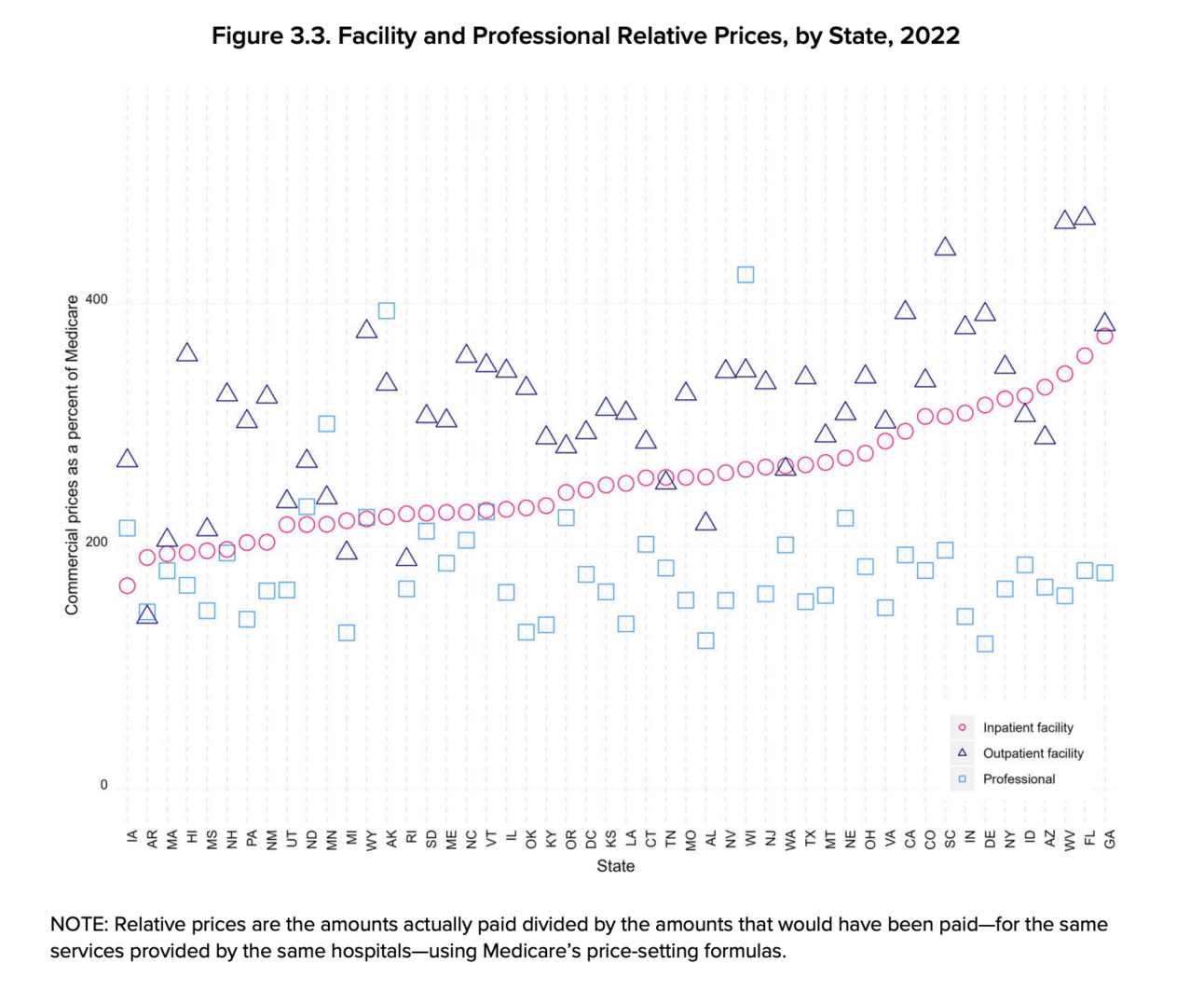 The latest data from Rand presents and interesting view into what hospitals are paid by employers. The chart above, which displays commercial rate as a % of Medicare by state, highlights the variability across states and also the differences between the prices of inpatient facility, outpatient facility, and professional rates compared to Medicare. Seven states had relative prices above 300% of Medicare.