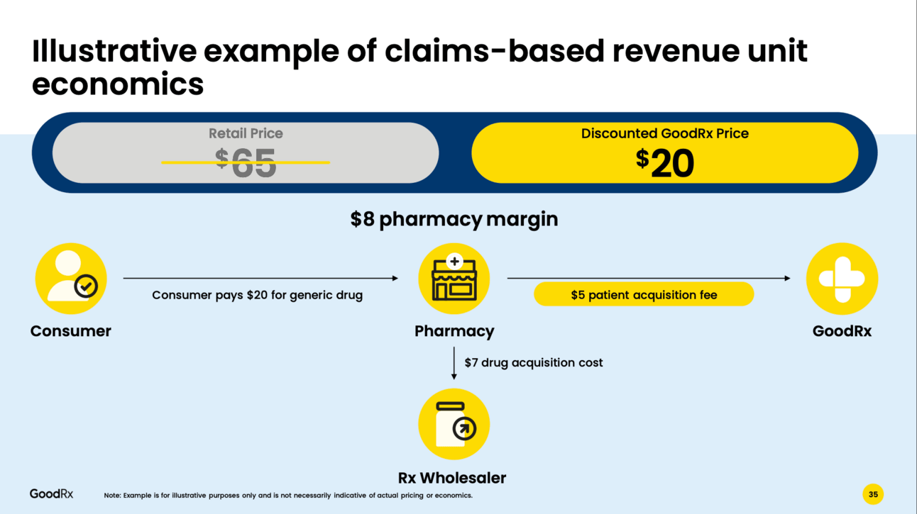 I spent more time this week focused on the BofA presentation so I haven’t dug deep into the GoodRx Investor Day yet, but even perusing the slides is a helpful activity if you’re trying to understand the GoodRx model. They do a nice job articulating the various components of the business. For instance, see the slide below describing the dollar flows for GoodRx’s claims-based revenue model, which is the majority of revenue for GoodRx: