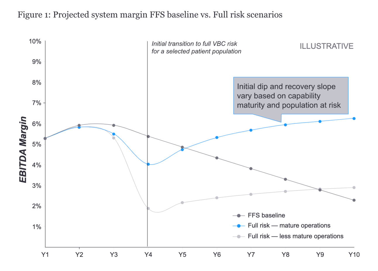 EY-Parthenon highlights the potential upside and downside for health system profitability in adopting risk-based contracts. The article highlights five capabilities that systems should invest in to succeed when moving to VBC: 1. growing attributed patients; 2. risk coding; 3. site of care management; 4. control OpEx; 5. physician alignment.
