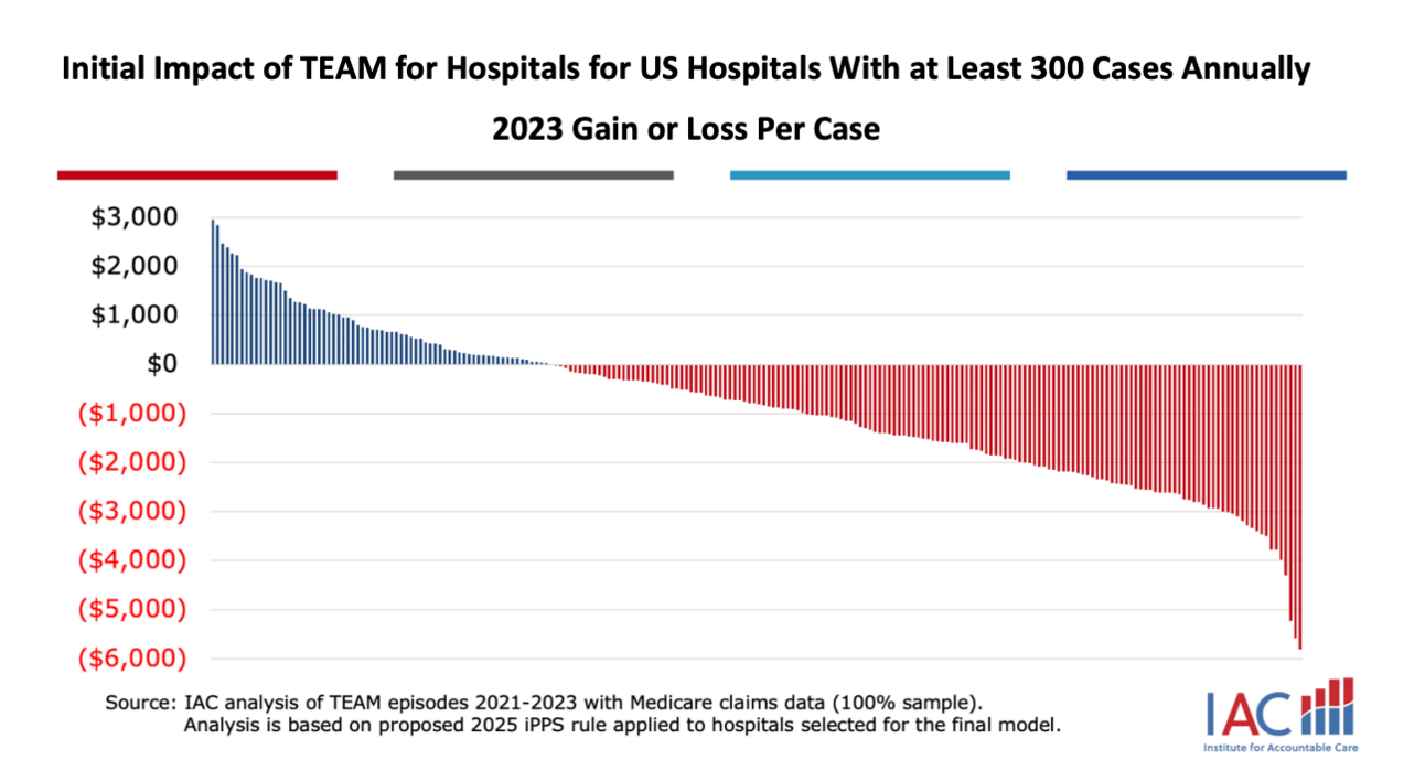 A consulting group shared an analysis exploring the impact of CMMI’s Transforming Episode Accountability Model (TEAM). TEAM is a new mandatory bundle model that will start in 2026 and require that almost 700 hospitals take financial risk on five surgical episodes that collectively represent ~15% of hospitals Medicare revenue. As the chart below shows, IAC estimates that a majority of hospitals will lose money on each case based on historical Medicare data, with some hospitals losing upwards of $4,000 per case.